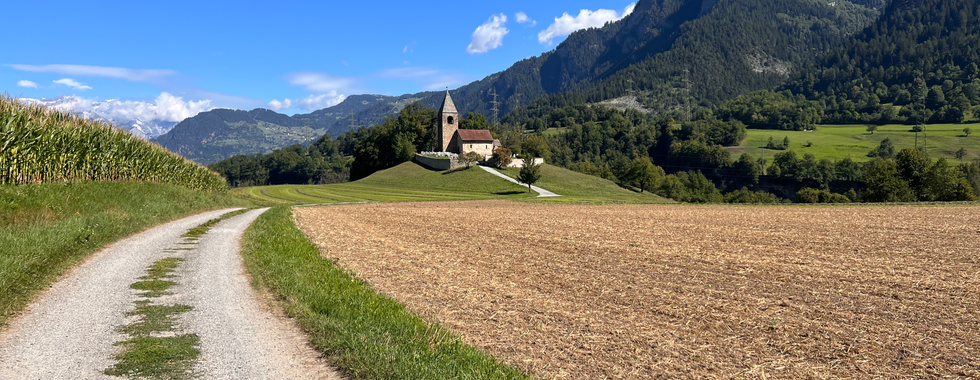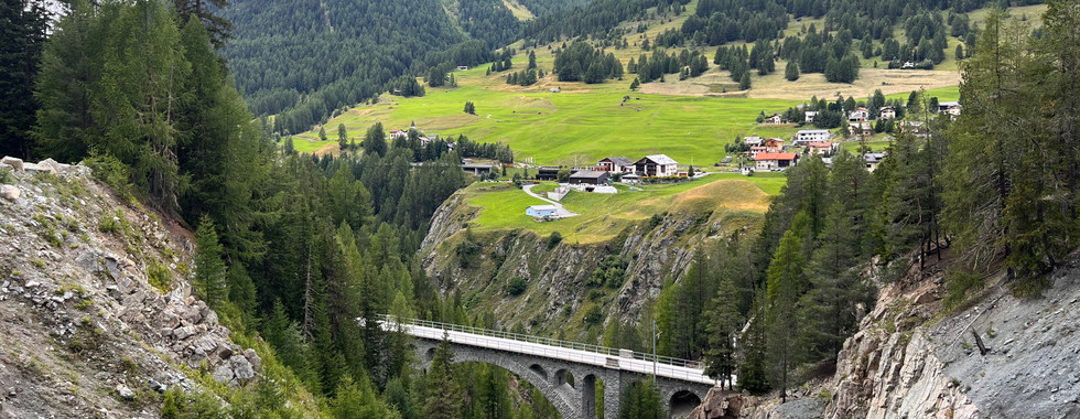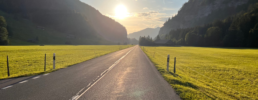 Tag 6 sollte mich zurückbringen an eine bereits bekannte Strecke am Rhein. Der Tag beginnt mit schönstem Wetter und Sonne, deren erste Strahlen über der Bergkette auftauchen. Das erste Teilstück nach Tiefencastel ist ein schöner Almweg, der durch nette, kleine Dörfer führt und u.a. vorbei an einem Hoflädli. Von dort folgt die Strecke dem Fluss Albula bis zur Einmündung in den Rhein in Bonaduz. Die neue Richtung orientiert sich am Rheinursprung am Oberalppass. Auf den Abschnitt an der Rheinschlucht hab ich mich schon gefreut - der Blick hinunter auf den Fluss, die Straße an der Felswand und durch kurze Tunnelstücke. Nach dem Anstieg lege ich in Versam beim Gasthaus Rössli eine Pause ein. Die Gaststätte mit hauseigener Brauerei ist nicht nur wegen seiner Speisekarte ein besonderer Tipp, sie hat auch eine großartige Terrasse mit einem herrlichen Blick auf das Rheintal.