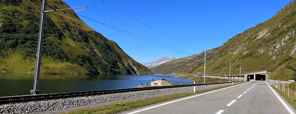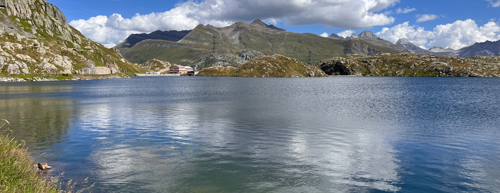 Nächstes Zwischenziel: Der Grimselpass. Sein Anblick hatte mich schon 2021 bei der Alpentour beeindruckt.. Der Aufstieg dorthin ist durch zahlreiche Serpentinen gekennzeichnet. Auf halber Höhe landet ein Hubschrauber nach einem Unfall. Oben angekommen erwartet mich der Totensee, eingebettet in dieses Hochplateau. Im See spiegeln sich der blaue, fast wolkenlose Himmel und die Gebirgskette. Auf der Sonnenterrasse des Alpenrösli mit Seeblick und umringt von Berggipfeln lässt es sich aushalten.
