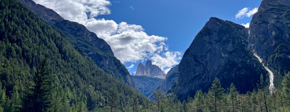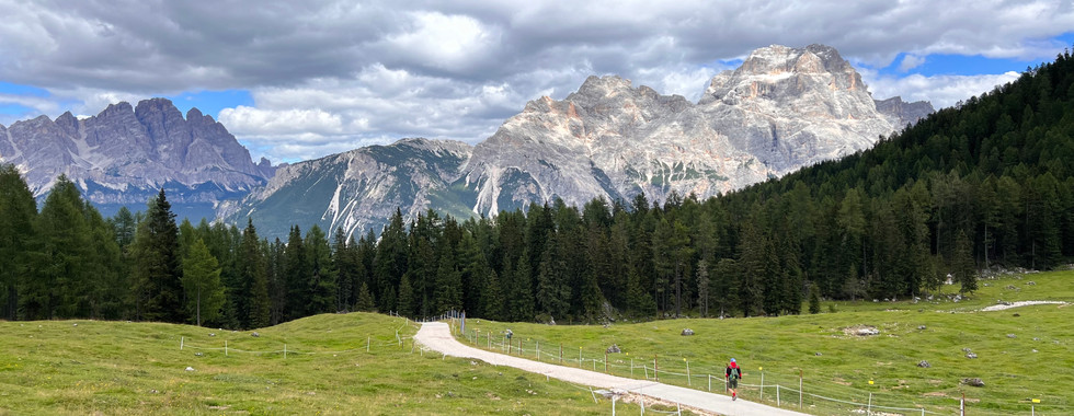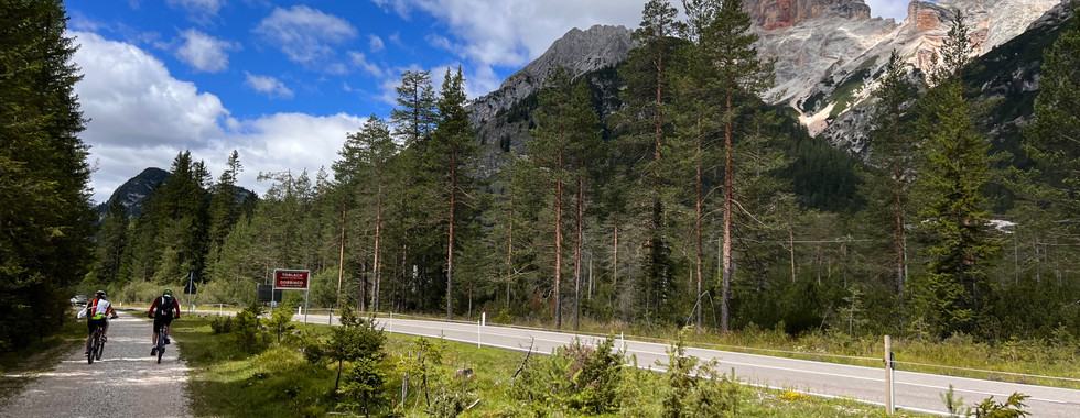 In Toblach biegt die Strecke nach Süden ab entlang einer gut besuchten Wanderroute. Bei Kilometer 33 gibt die Bergkette zur Linken den Blick auf die drei Zinnen frei. Nach einem letzten mäßigen Anstieg folgt eine lange Abfahrt nach Cortina d’Ampezzo.