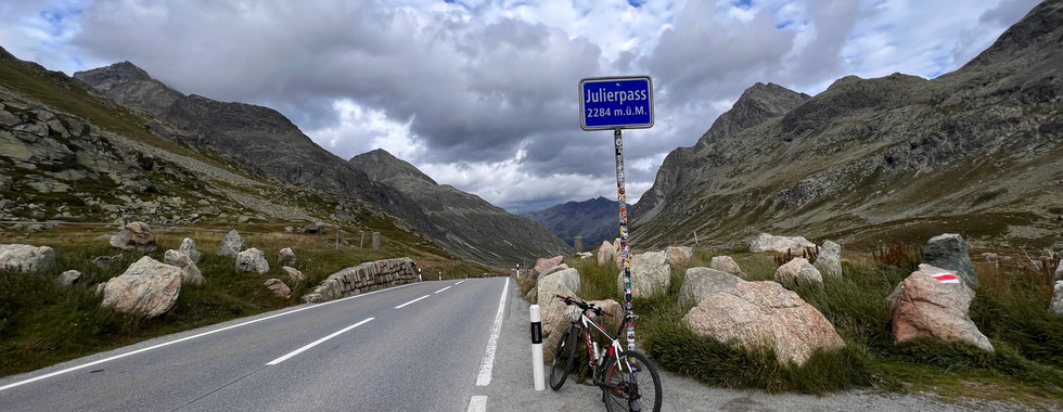 Ein kleiner Anstieg und dann ist es soweit: Der Blick auf St. Moritz, seinen See und die Bergkette dahinter. Ein kurzer Zwischenstopp am Wasser und diesen besonderen Ort auf sich wirken lassen… bevor es weitergeht auf den Julierpass: 500 Höhenmeter Anstieg auf 2.284 m. Um diese Uhrzeit (ca. 19.00) gibt es nur sehr wenig Verkehr hier. Der Aufstieg ist begleitet von einem schönen Bergpanorama und mit jedem Pedaltritt habe ich das Gefühl, dass ein Stück mehr Ruhe und Frieden mich erfüllen. Die Ankunft auf der Passhöhe ist einer der besondersten Momente auf dieser Tour: Ich bin völlig alleine an diesem Ort. Kein Auto zu hören. Nur das Juliertheater, das die Naturlandschaft kunstvoll durchbricht und sonst - völlige Stille. Stille, die manchmal in rhythmischen Abständen durch das typische Geräusch eines über mir kreisenden Greifvogels durchbrochen wird. Minuten des In-sich-Ruhens und Bei-sich-Seins.