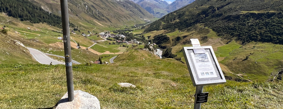 Dann geht es weiter nach Realp, wo der 12 km lange Anstieg über 850 Höhenmeter auf den Furkapass beginnt. Bei malerischen Bedingungen und 30 Grad ist hier am Wochenende viel Urlaubsverkehr. Am Passübergang erwartet einen der Ausblick ins beginnende Rhonetal mit dem nächsten Anstieg auf den Grimselpass. Dort gibt es auch einen beliebten Photo Point für Radfahrer mit dem Hinweisschild auf die Grand Tour de Suisse. 2 km abwärts erreiche ich das Gletscher Stübli (mit Blick auf das Hotel Belvedere), wo ich den nächsten Zwischenstopp mache, diesmal um meine abgefahrenen Bremsbeläge vor der nächsten Talfahrt zu wechseln. Viele Durchreisende halten hier an und buchen die kleine Wanderung zum Rhonegletscher und -ursprung. Ein imposanter Anblick, wie das Wasser ins beginnende Rhonetal stürzt.